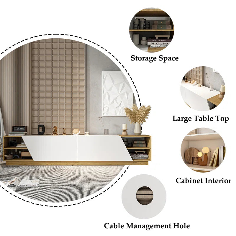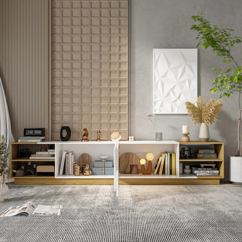 Add modern elegance to your living space with the Arelene 94" Low-Profile TV Stand, featuring a sleek white and oak finish that complements any décor. Its wide design accommodates large TVs, while geometric-patterned doors and open shelves provide stylish and functional storage. Perfect for organizing media equipment, books, or decorative items, this stand combines sophistication with everyday practicality.