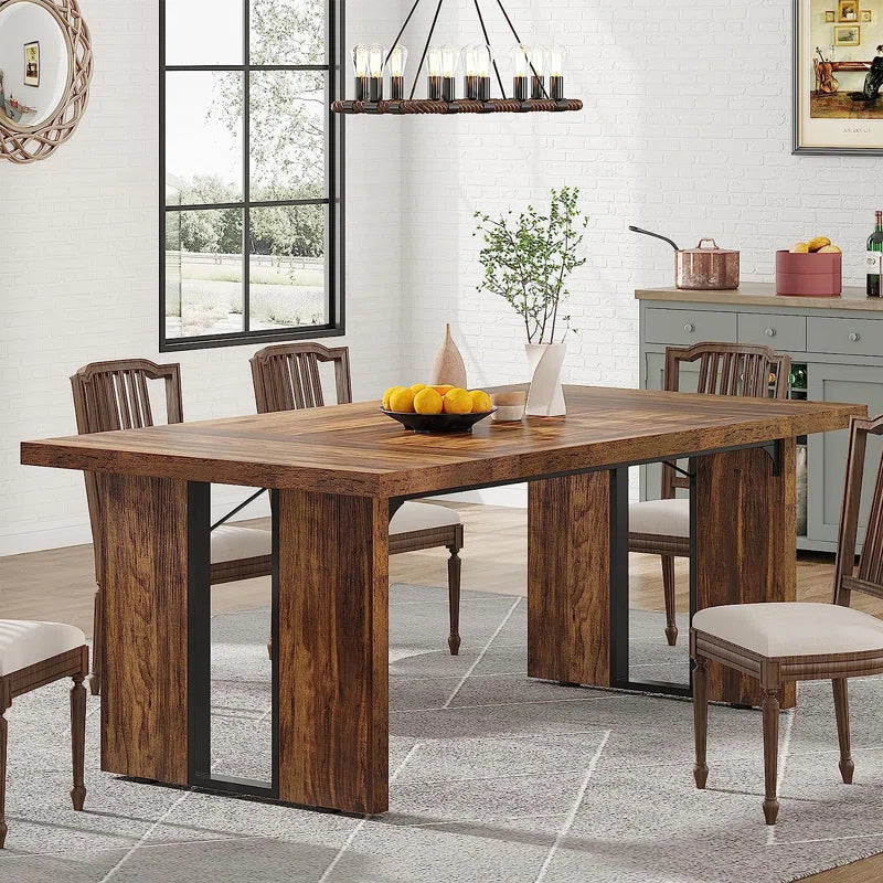 This modern farmhouse dining table brings a touch of rustic charm to your dining room, seating up to eight guests comfortably. It features a rectangular tabletop made from engineered wood, showcasing natural wood grain color variation for an authentic look. The double pedestal base adds a classic element to the design while providing ample legroom for your dinner parties. This table is scratch-resistant, ensuring that it maintains its beauty through everyday use. Gather your family and friends around this inviting dining table for memorable meals and lively conversations.