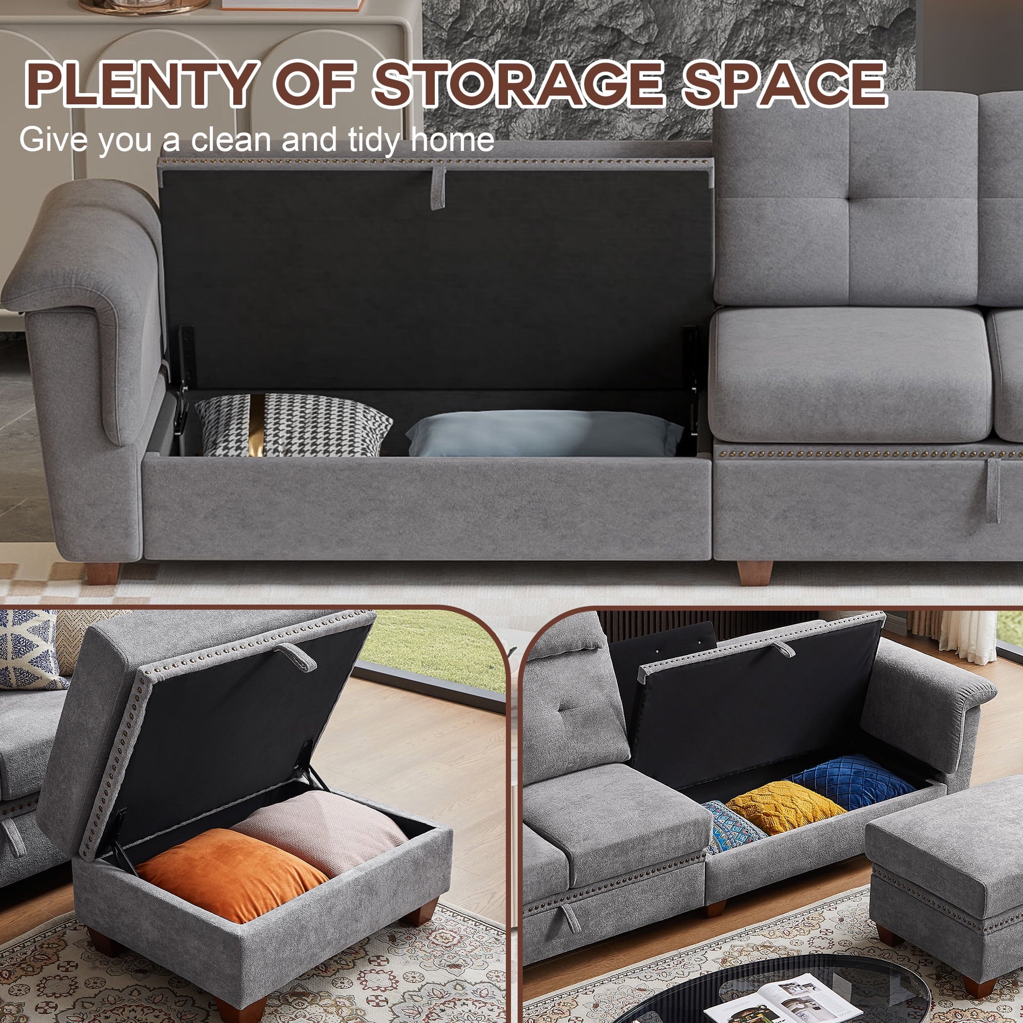 Upgrade your living room with the Convertible 4-Seat Sectional Sofa, combining comfort, storage, and modern design. Upholstered in soft light grey microfiber fabric, this L-shaped couch features a spacious chaise, built-in cup holders, and hidden storage for blankets or essentials. Perfect for family rooms or apartments, it offers both style and functionality for everyday living.