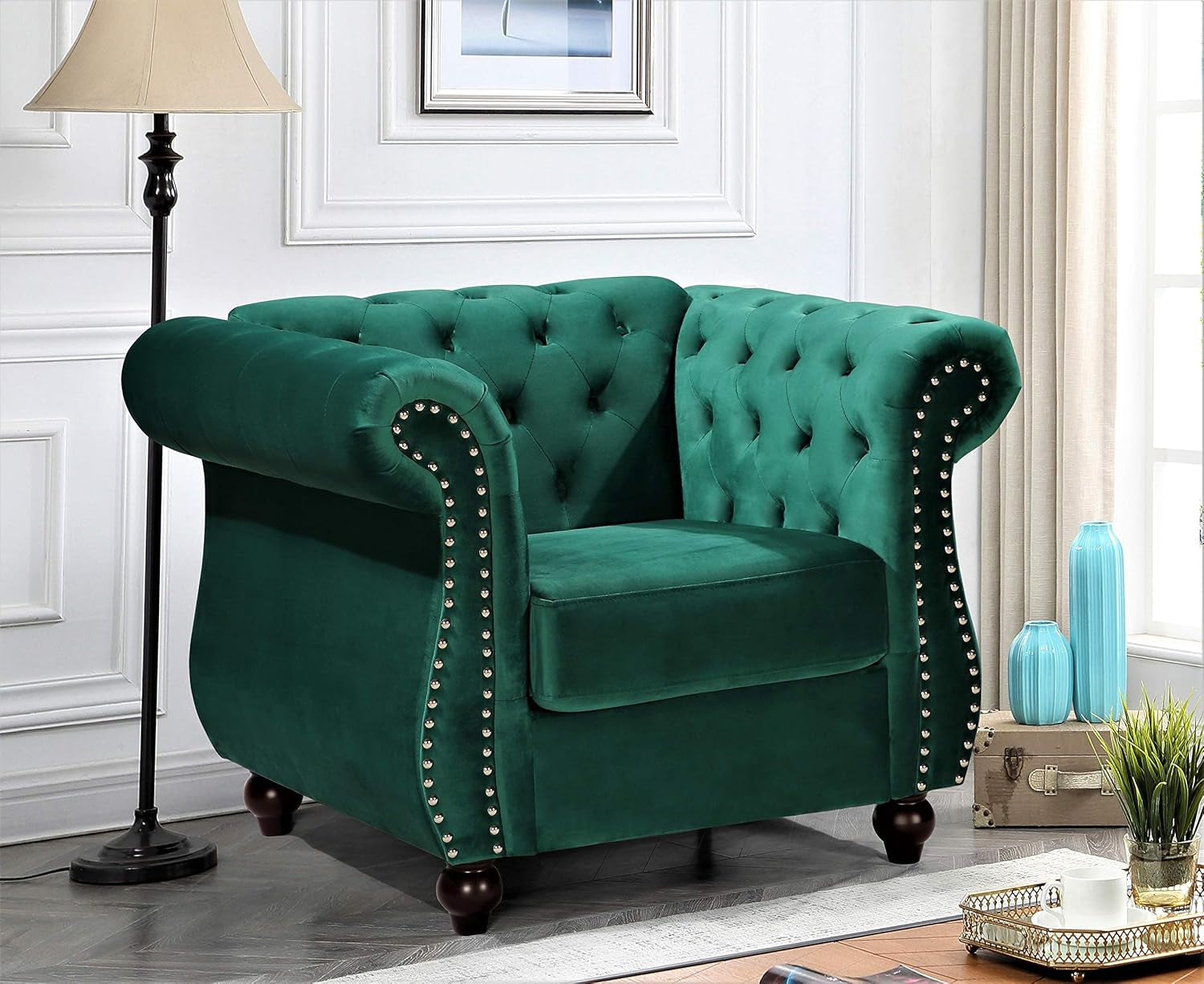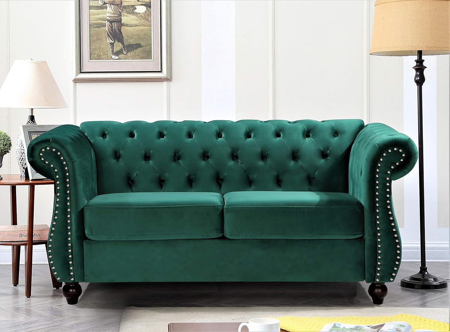 Add luxury and sophistication to your living room with the Feinstein Modern Velvet Chesterfield Sofa, featuring elegant diamond tufting and classic nailhead detailing. Upholstered in rich green velvet, this statement piece combines timeless style with modern craftsmanship. The durable metal frame ensures lasting stability, while the plush cushions provide exceptional comfort. Available in chair, loveseat, and sofa options to suit any space.
