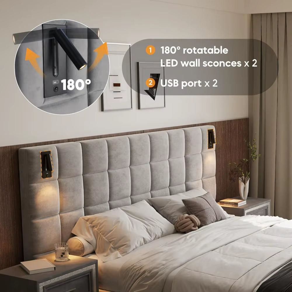 Bring sophistication and comfort to your bedroom with the King Velvet Upholstered Platform Bed Frame, featuring a soft grid-patterned padded headboard and built-in LED wall sconces for ambient lighting. The elegant velvet upholstery adds a touch of luxury, while the sturdy platform design provides excellent mattress support without requiring a box spring. Perfect for creating a refined and cozy sleeping space.