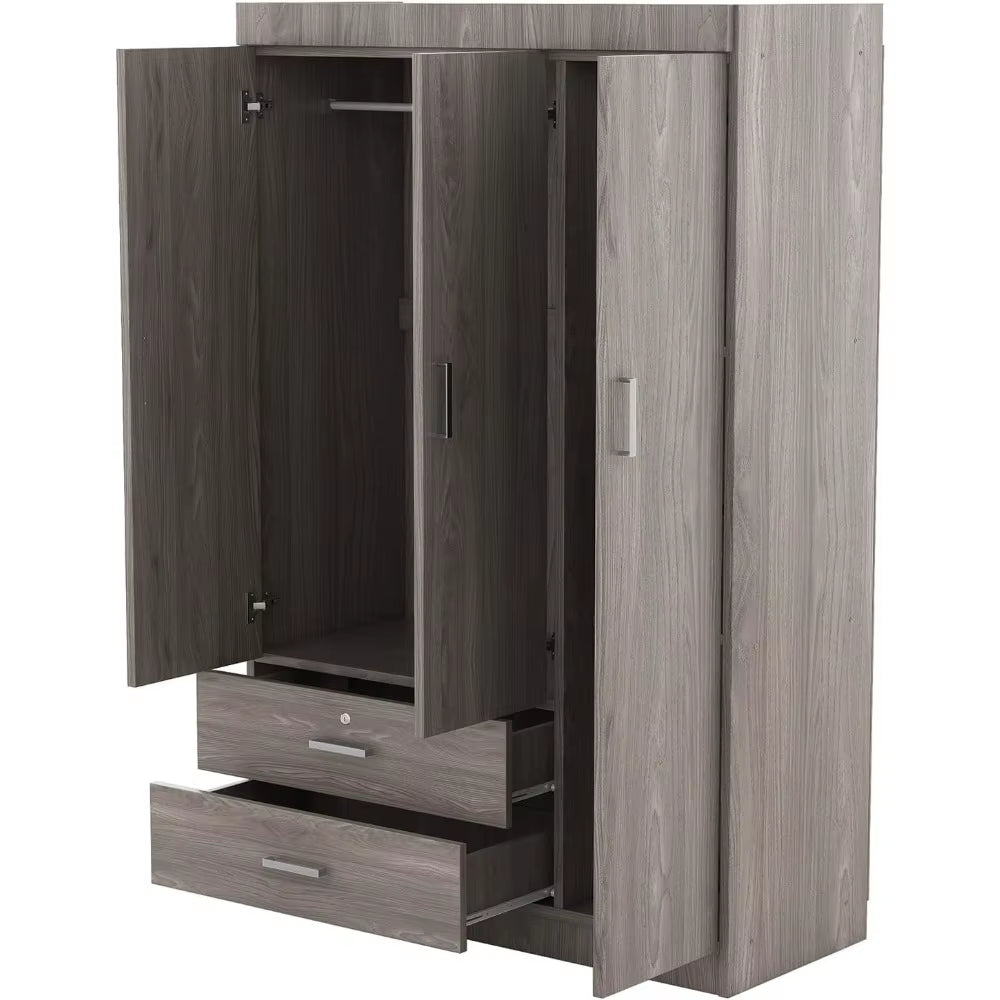 Organize your clothing in style with the Modern 3-Door Wardrobe, designed for functionality and a clean, contemporary look. It features three spacious doors that open to reveal shelves, a sturdy hanging rail, and two lower drawers for folded clothes or accessories. Built from durable materials, this freestanding armoire provides ample storage while complementing any bedroom décor.