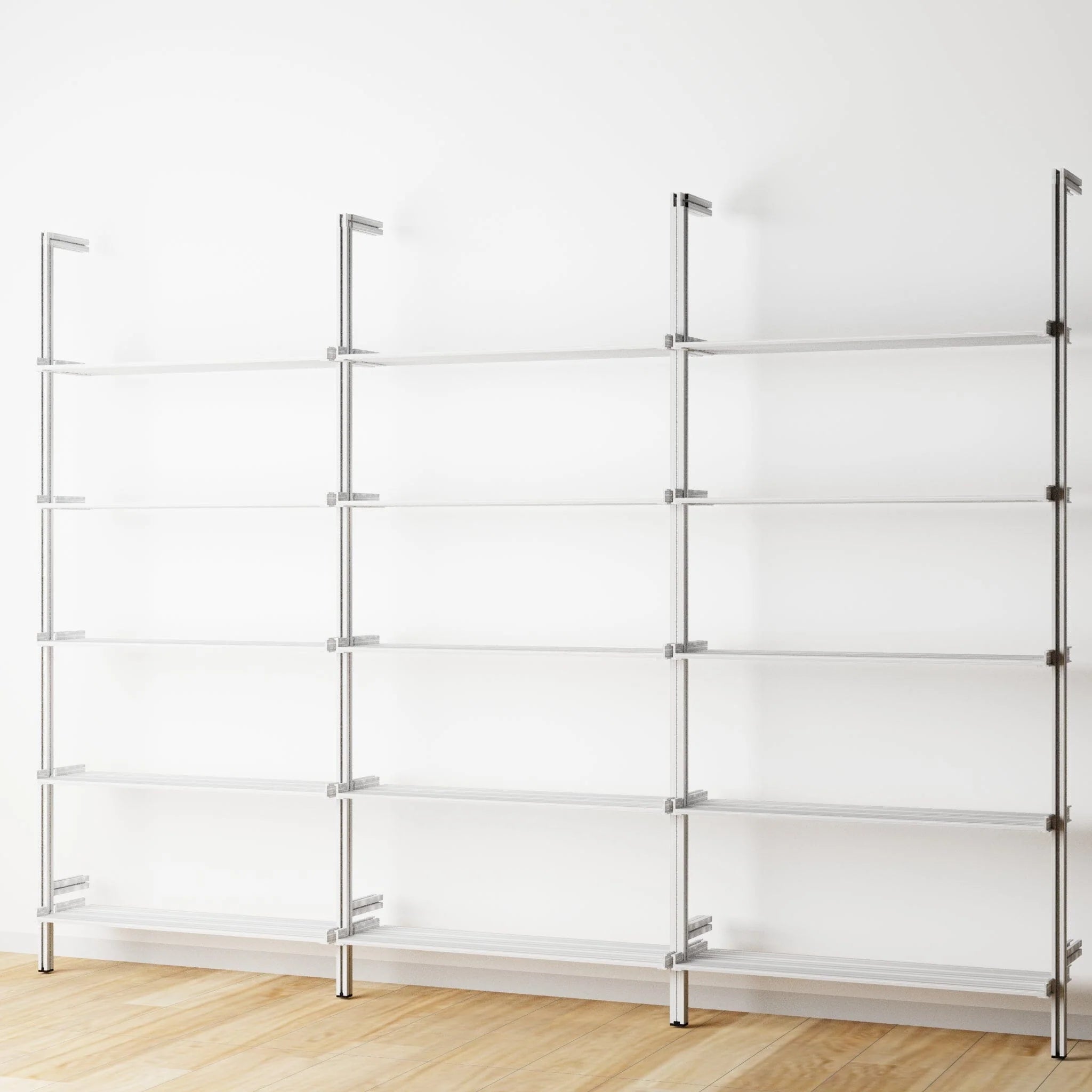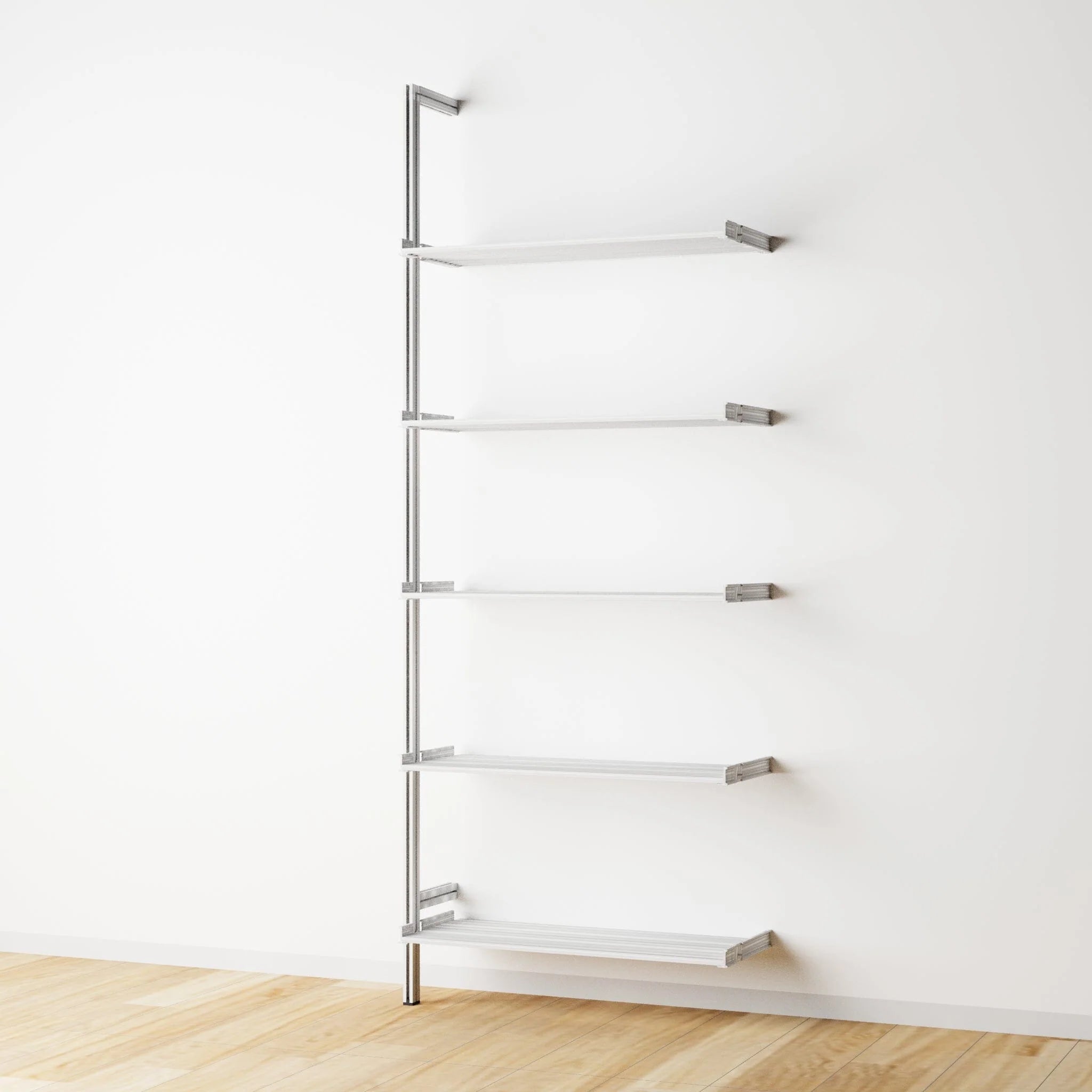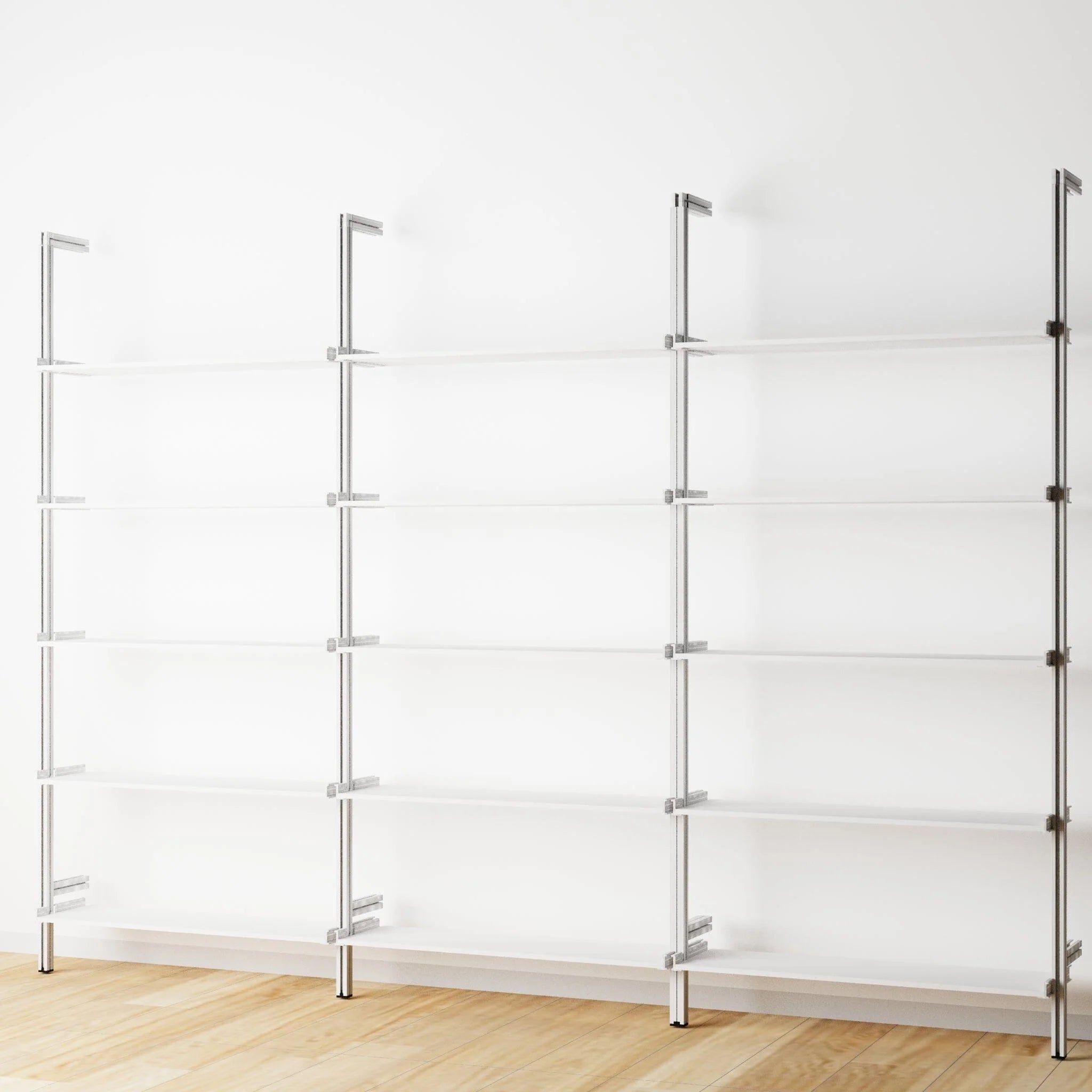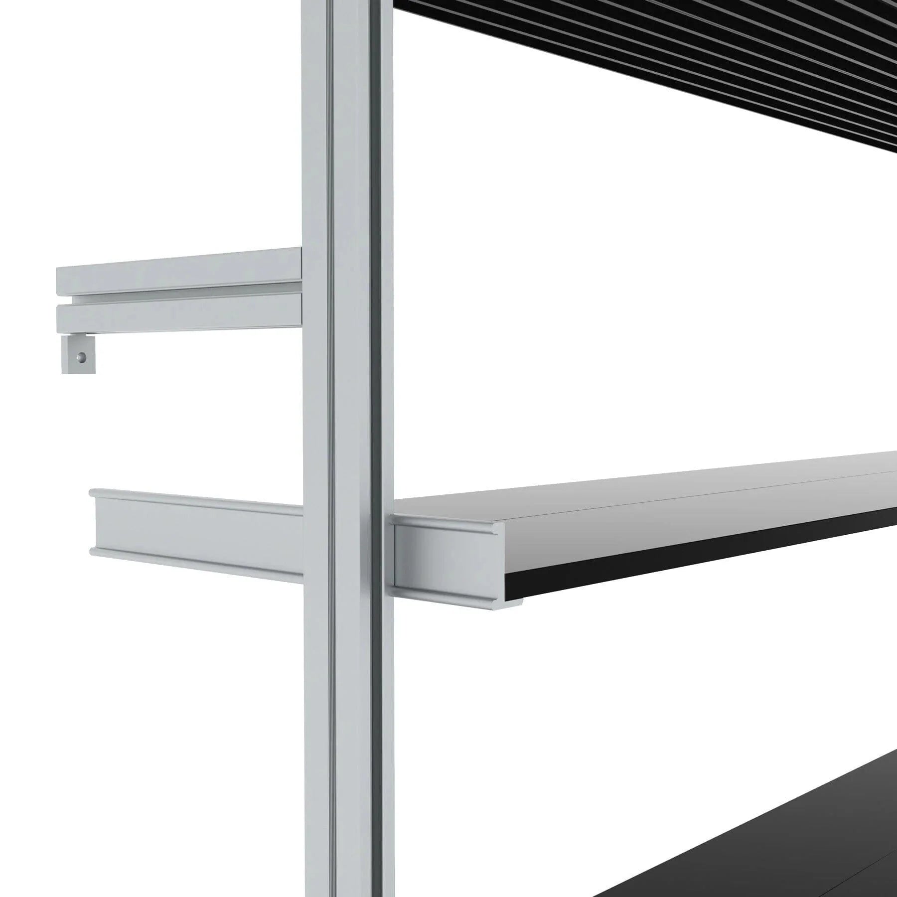 Immerse yourself in the strength and sleekness of our pole-mounted Modular Shelving Units from . Crafted from extruded anodized aluminum, this shelving system is not just furniture; it's a testament to durability and elegance. The pole-mounted design ensures stability, while the aluminum construction provides a modern and sophisticated aesthetic, turning your space into a showcase of strength and style.