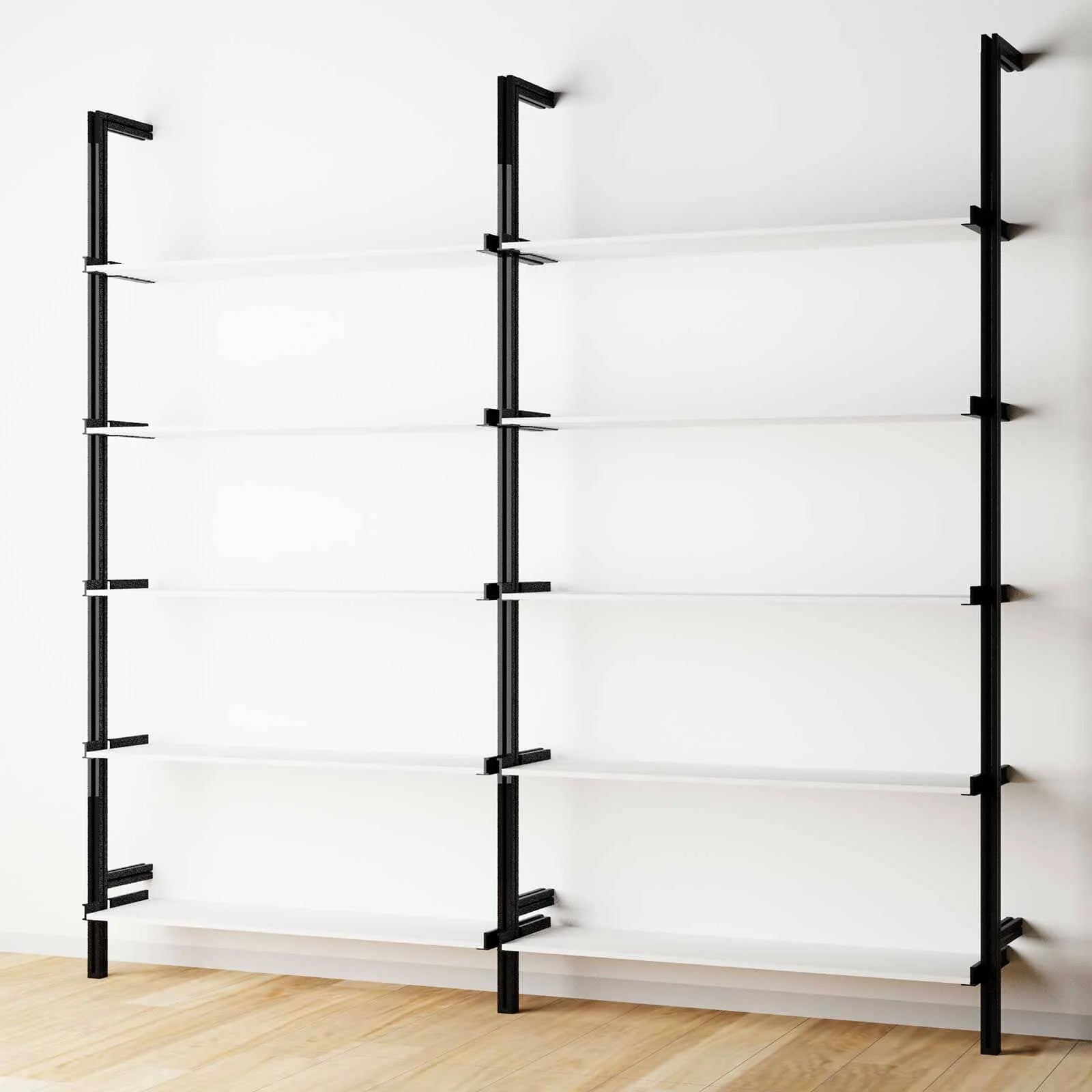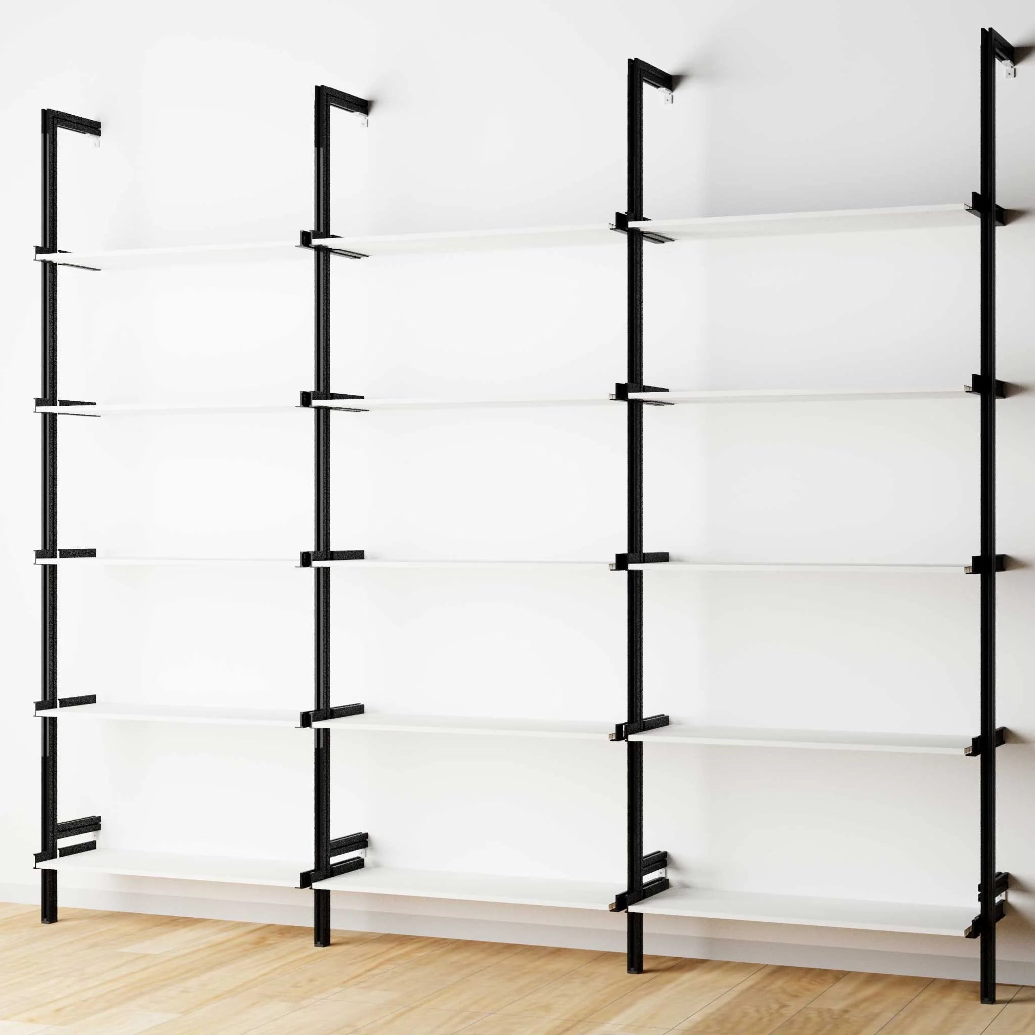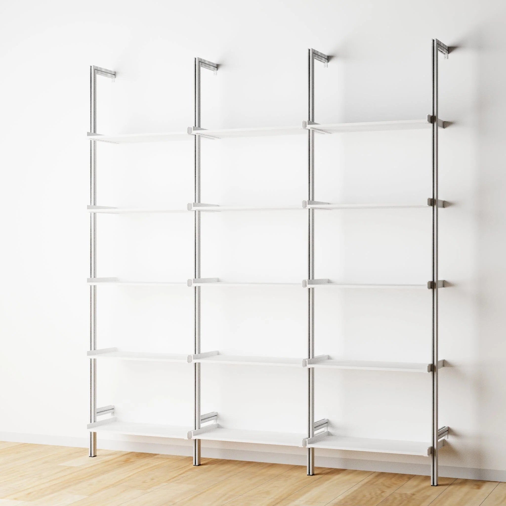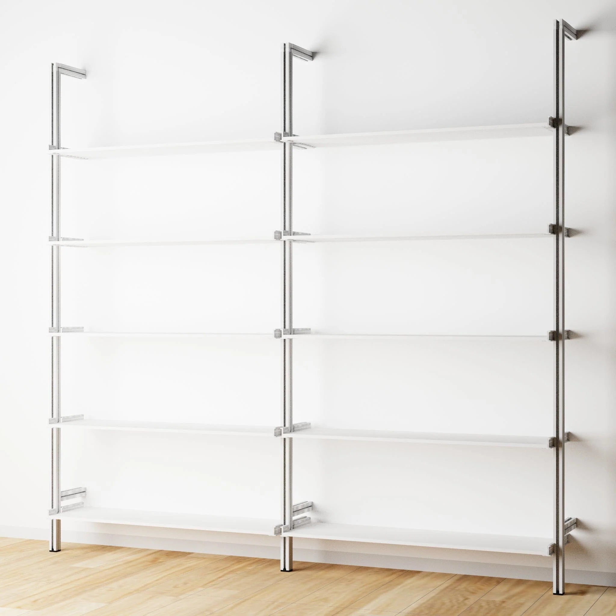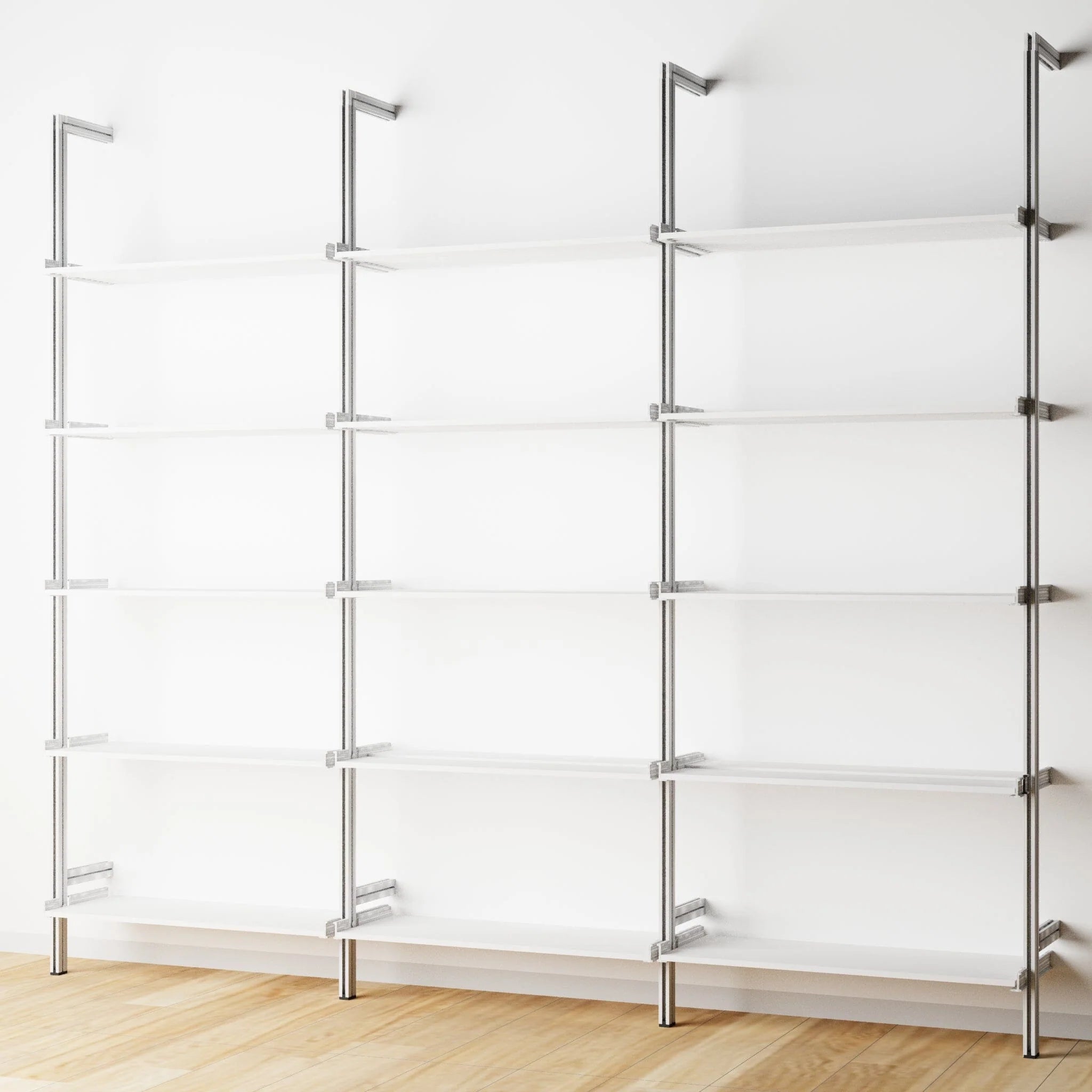 Immerse yourself in the strength and sleekness of our pole-mounted Modular Shelving Units from . Crafted from extruded anodized aluminum, this shelving system is not just furniture; it's a testament to durability and elegance. The pole-mounted design ensures stability, while the aluminum construction provides a modern and sophisticated aesthetic, turning your space into a showcase of strength and style.