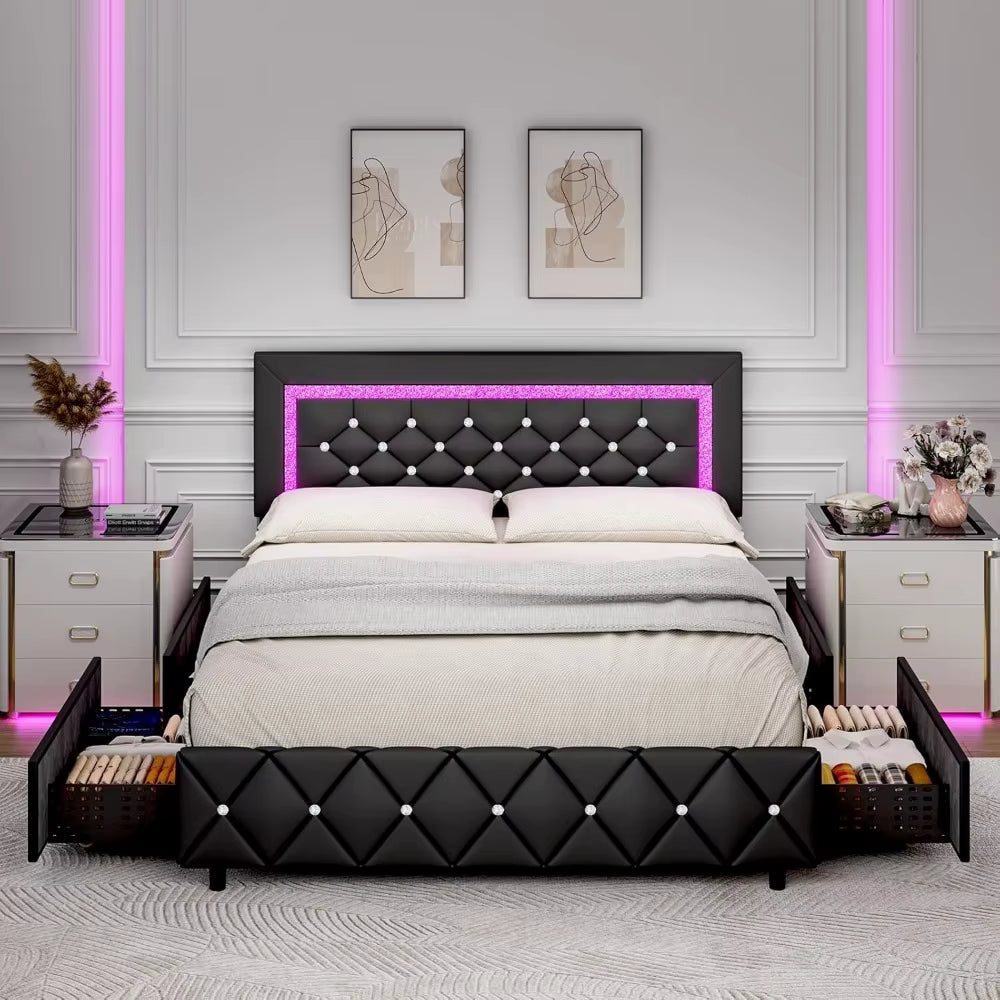 Add a touch of elegance and modern functionality to your bedroom with the Queen Upholstered LED Bed Frame. Featuring a luxurious diamond-tufted headboard and footboard, this bed offers built-in LED lighting for a stylish ambiance. The integrated storage drawers provide convenient space for bedding, clothes, or accessories, while the sturdy platform frame ensures excellent mattress support without the need for a box spring.