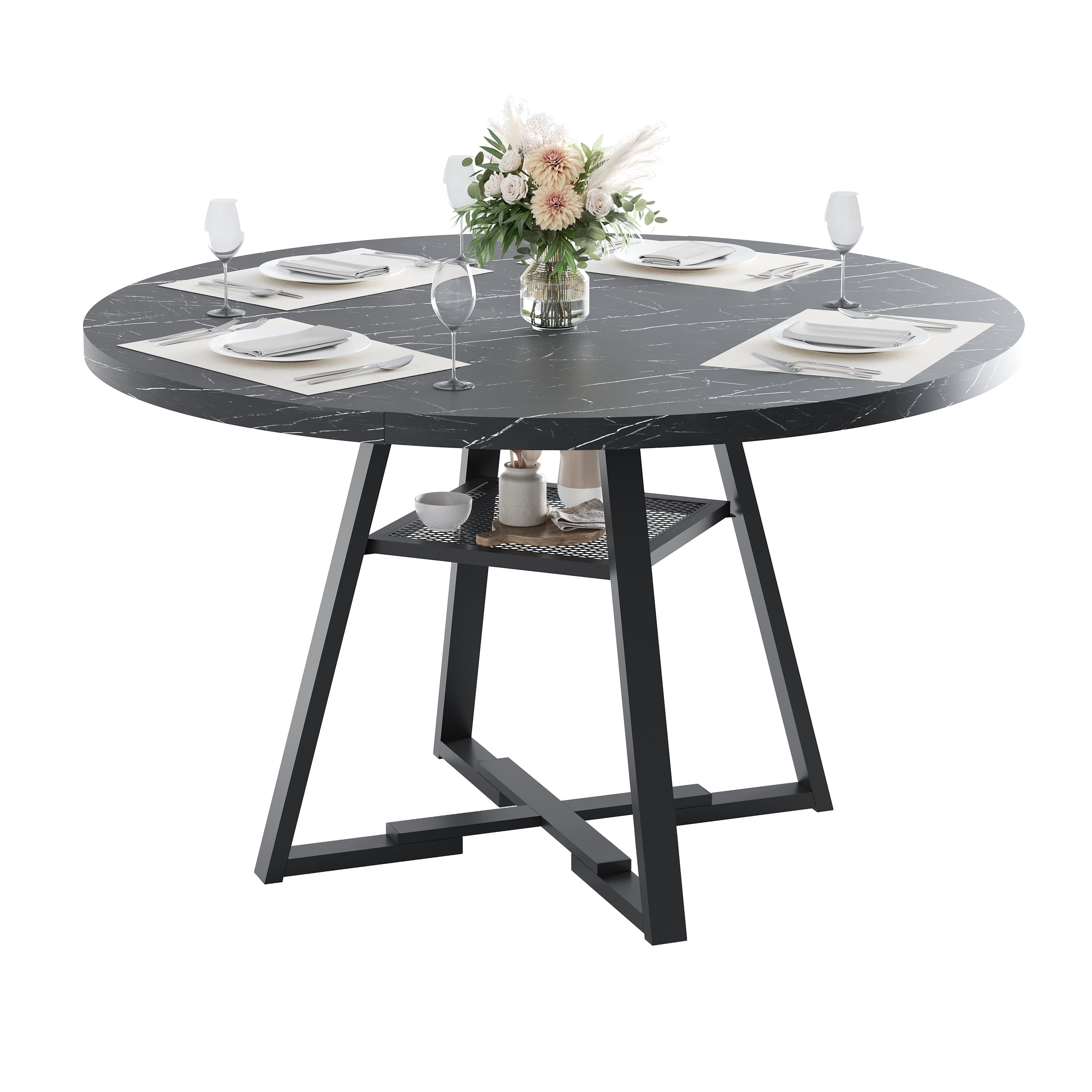 Add sophistication and practicality to your dining space with the Modern Round Dining Table, featuring a stunning black faux marble finish. The built-in storage shelf offers convenient space for dining essentials or décor, while the circular design promotes a cozy and elegant atmosphere. Perfect for kitchens, dining rooms, or apartments, this table comfortably seats up to four people and complements any modern interior style.
