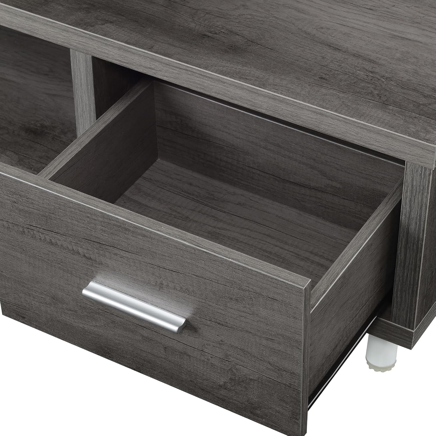 Elevate your living room setup with the Seal II 3-Tier TV Stand, a perfect mix of modern style and practical design. Featuring a sleek weathered gray finish, this entertainment center includes one smooth drawer and multiple open shelves for media devices, décor, or storage. Its sturdy construction supports TVs up to 65 inches, while the tiered layout adds a clean and organized look to your space.