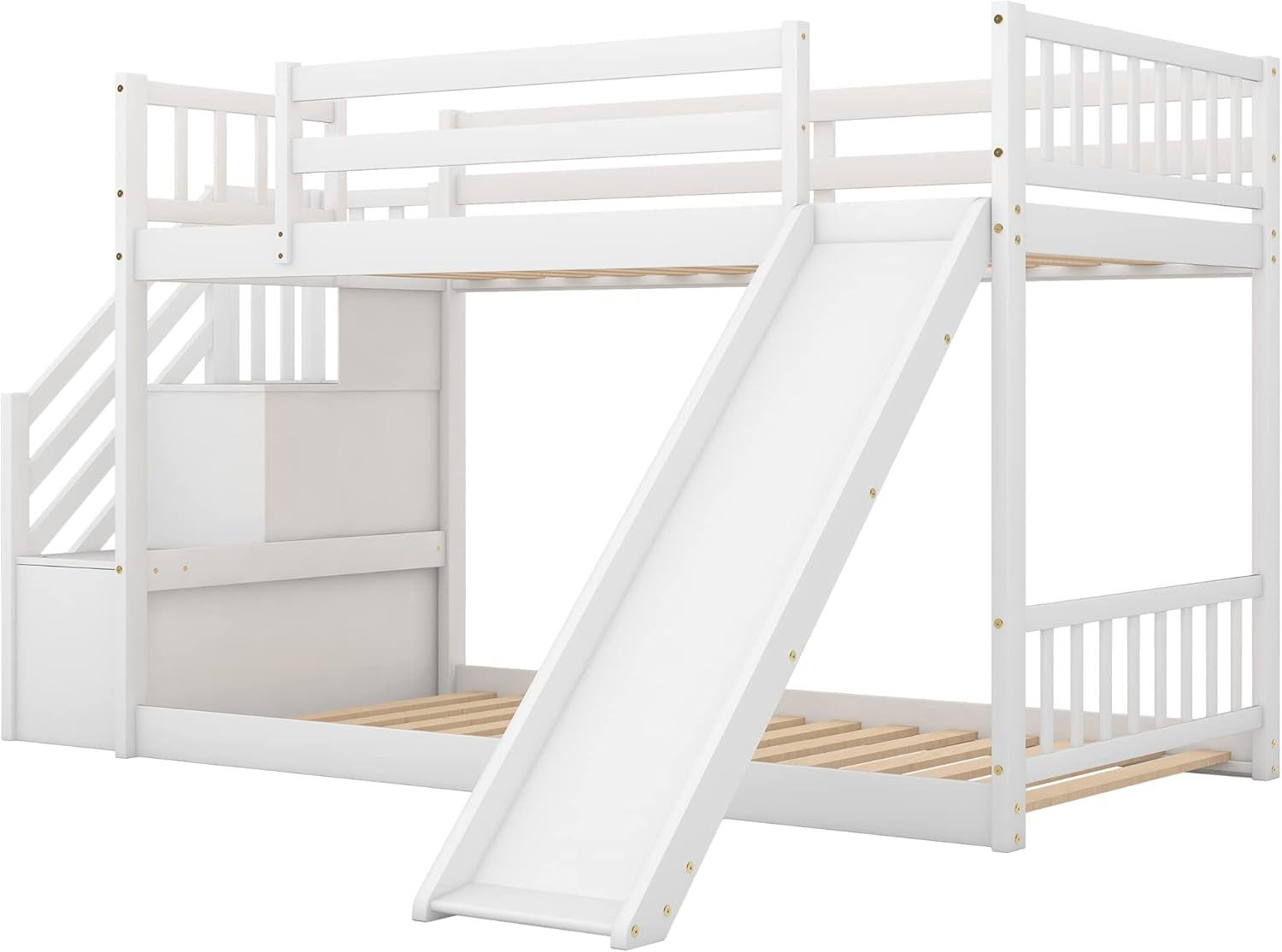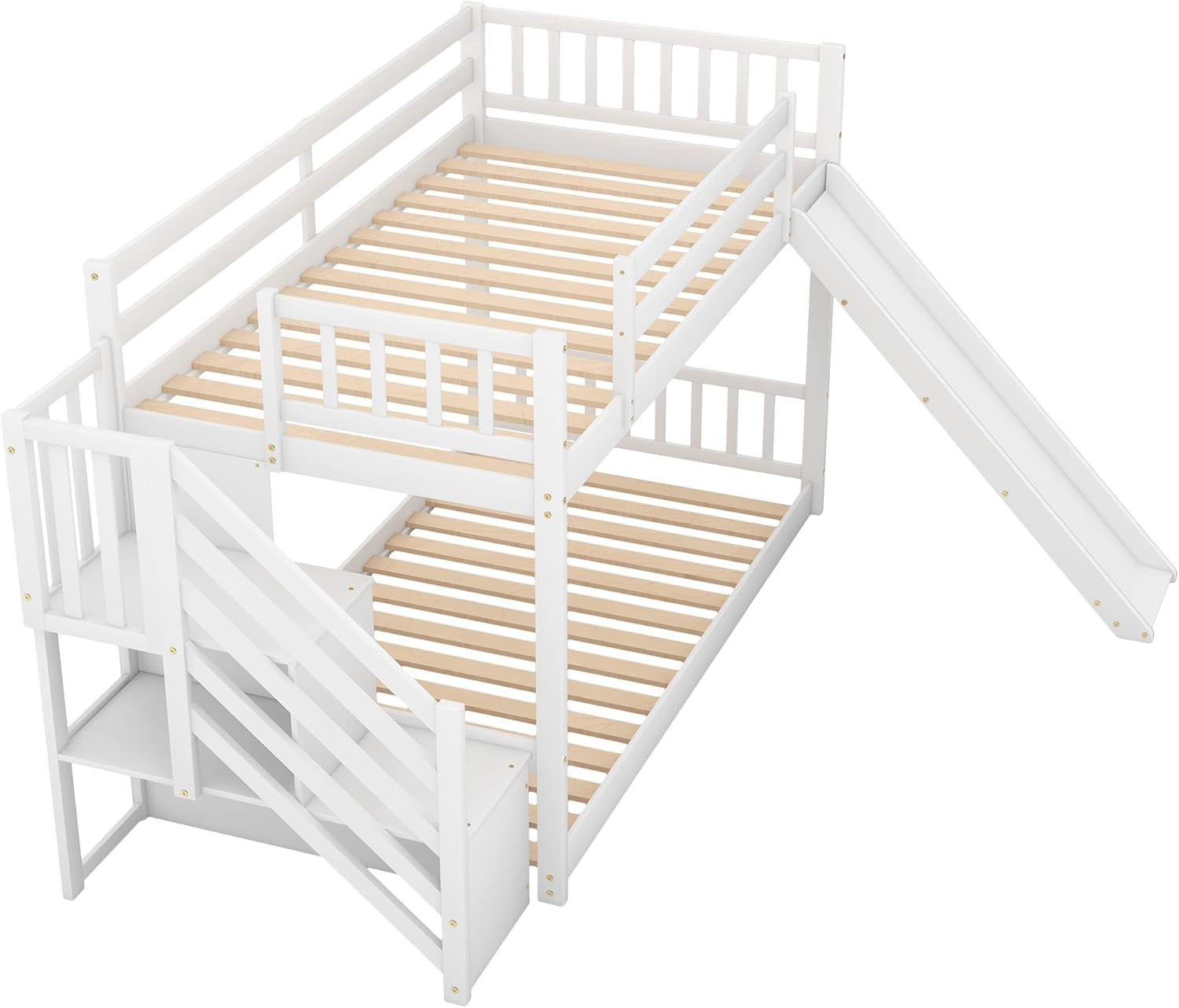Make bedtime fun and functional with the White Twin Bunk Bed with Slide, designed for kids’ bedrooms and shared spaces. This twin-over-twin wooden frame features a built-in stairway for safe access, storage compartments for toys or clothes, and full-length guard rails for security. The attached slide adds excitement, while the space-saving design maximizes room layout and organization.
